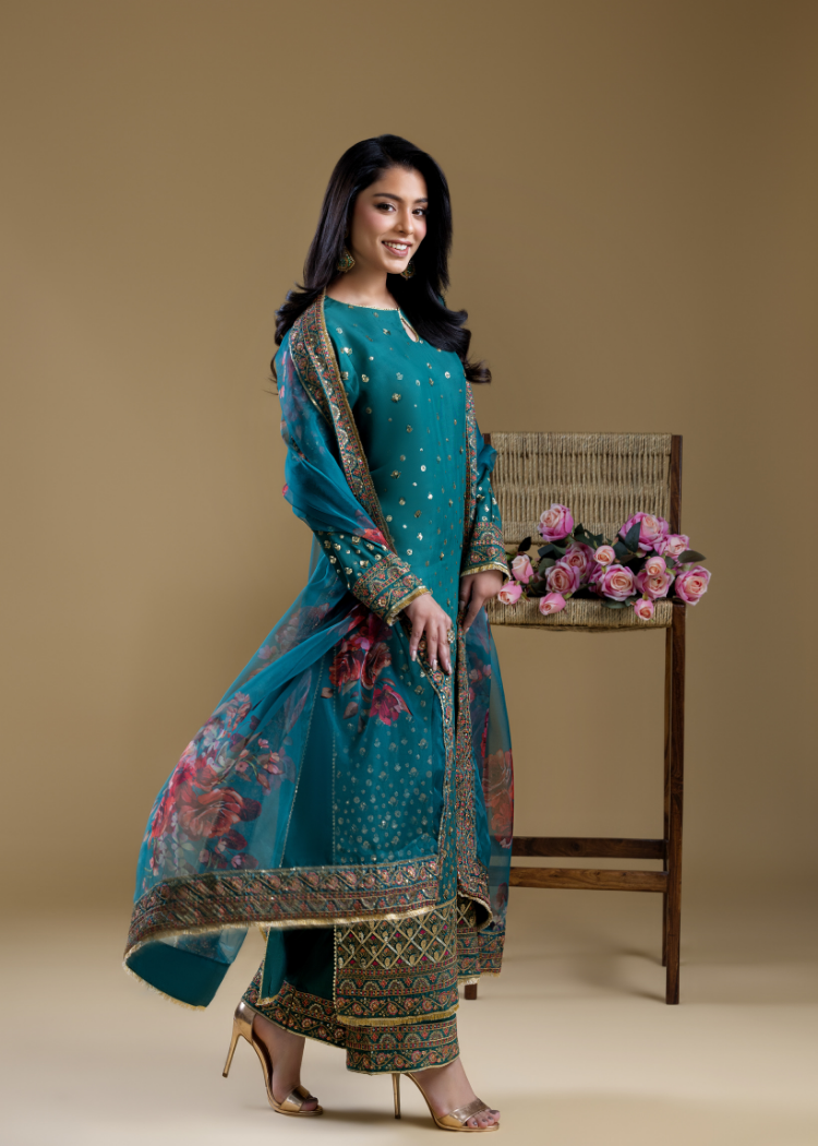 Emerald raw silk suit paired with a beautifully bordered Khadi organza dupatta