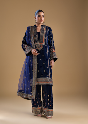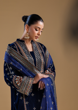 A rich Deep Blue velvet suit adorned with delicate gold embroidery, paired with an embellished with Embroidered net dupatta. Elegant, refined, and perfect for evening festivities.