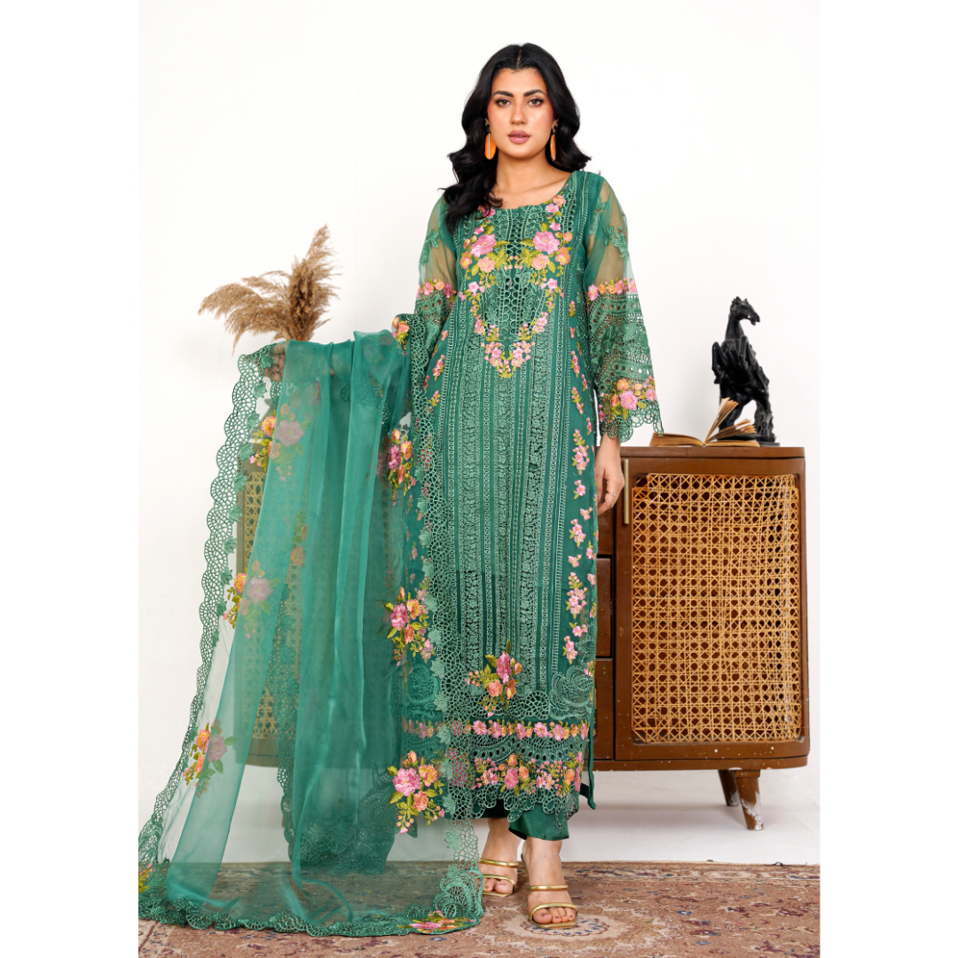 Radiate elegance in this jade green organza ensemble, adorned with intricate threadwork, kavia detailing, and pastel floral embroidery. Paired with an embroidered dupatta, it’s the perfect blend of tradition and modern grace for festive occasions.