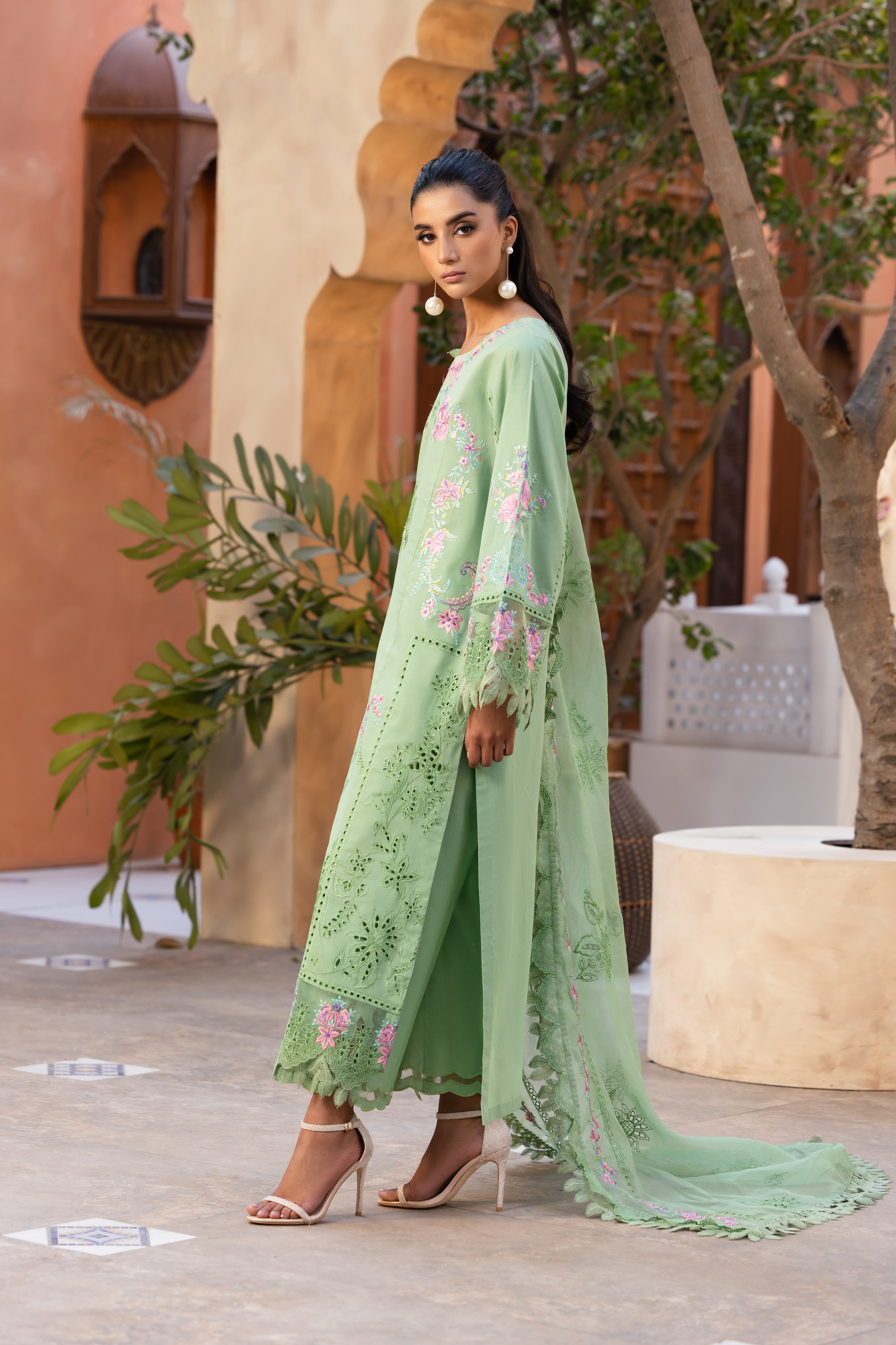 Drape yourself in the sophisticated charm of زمرد (Zamrud) – a stunning mint green ensemble adorned with delicate floral embroidery and intricate cutwork detailing. This ethereal outfit is designed for those who appreciate grace and elegance, making it a perfect choice for festive and formal occasions.