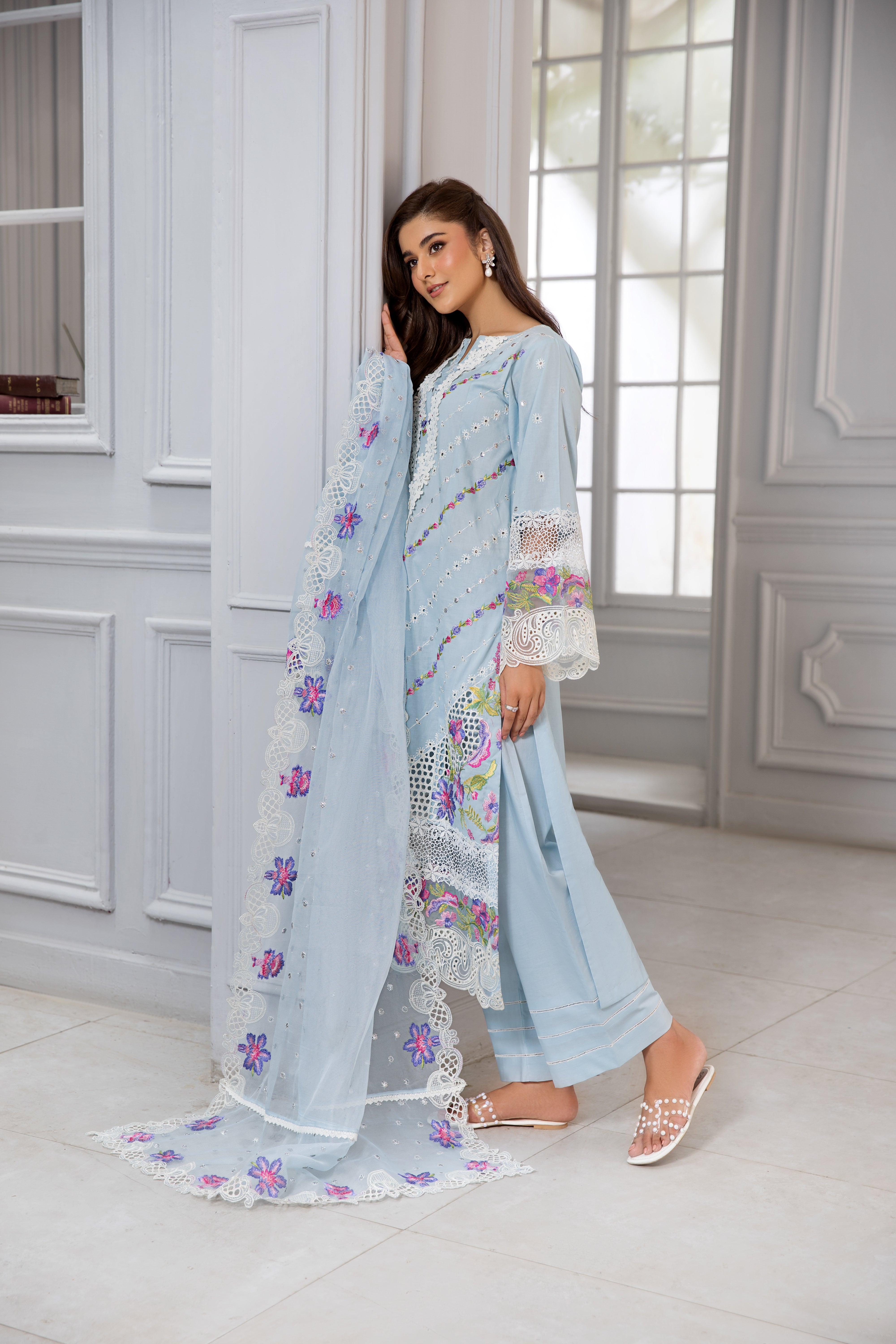 شفق is a soft blue dress with white lace and pretty embroidery in pink, purple, and green. The shirt has detailed lace and cutwork on the neckline, sleeves, and border. It comes with a light net dupatta full of floral embroidery and lace edges. The straight trousers match perfectly in the same pastel blue. A perfect outfit for a fresh and elegant look.