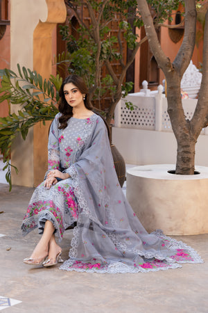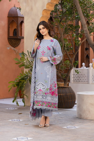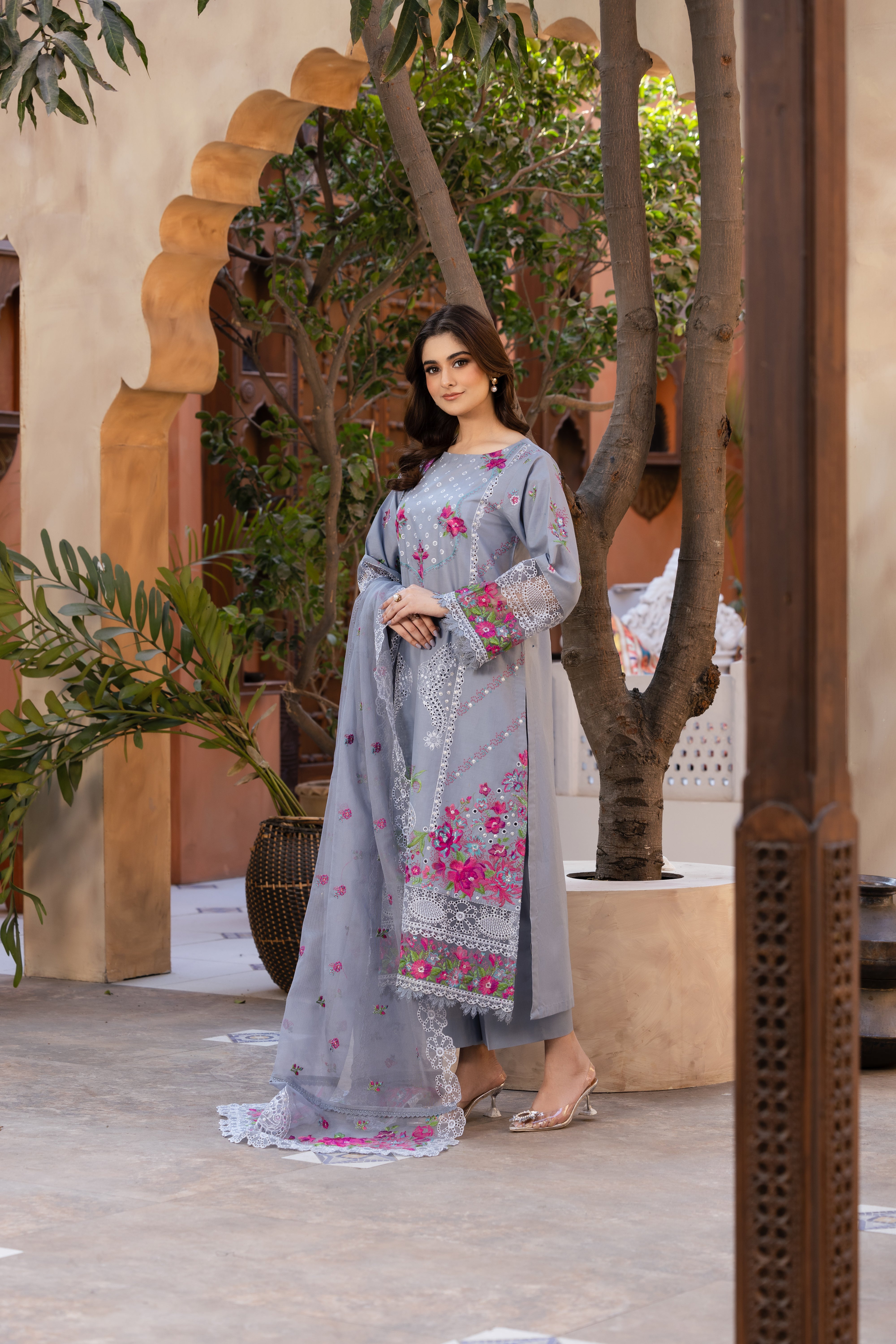 مہک ناز is a graceful soft grey embroidered ensemble, adorned with delicate pink floral embroidery and intricate lace detailing. The dreamy khadi net dupatta, finished with embroidered borders, adds a touch of ethereal charm to this exquisite outfit.