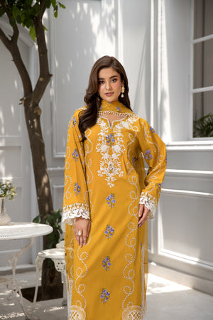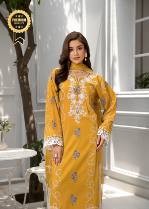A graceful fusion of color and craftsmanship, کیسر is a standout piece in Afiay’s exclusive collection. Drenched in a rich mustard tone, this elegant 3-piece suit is adorned with intricate white and purple-blue embroidery that adds a timeless charm to its look.