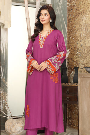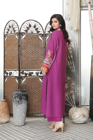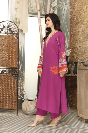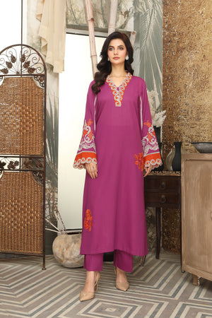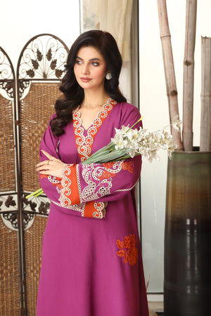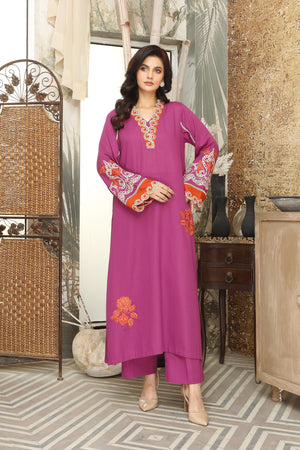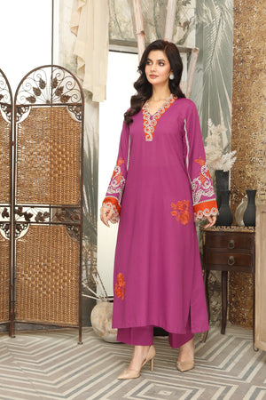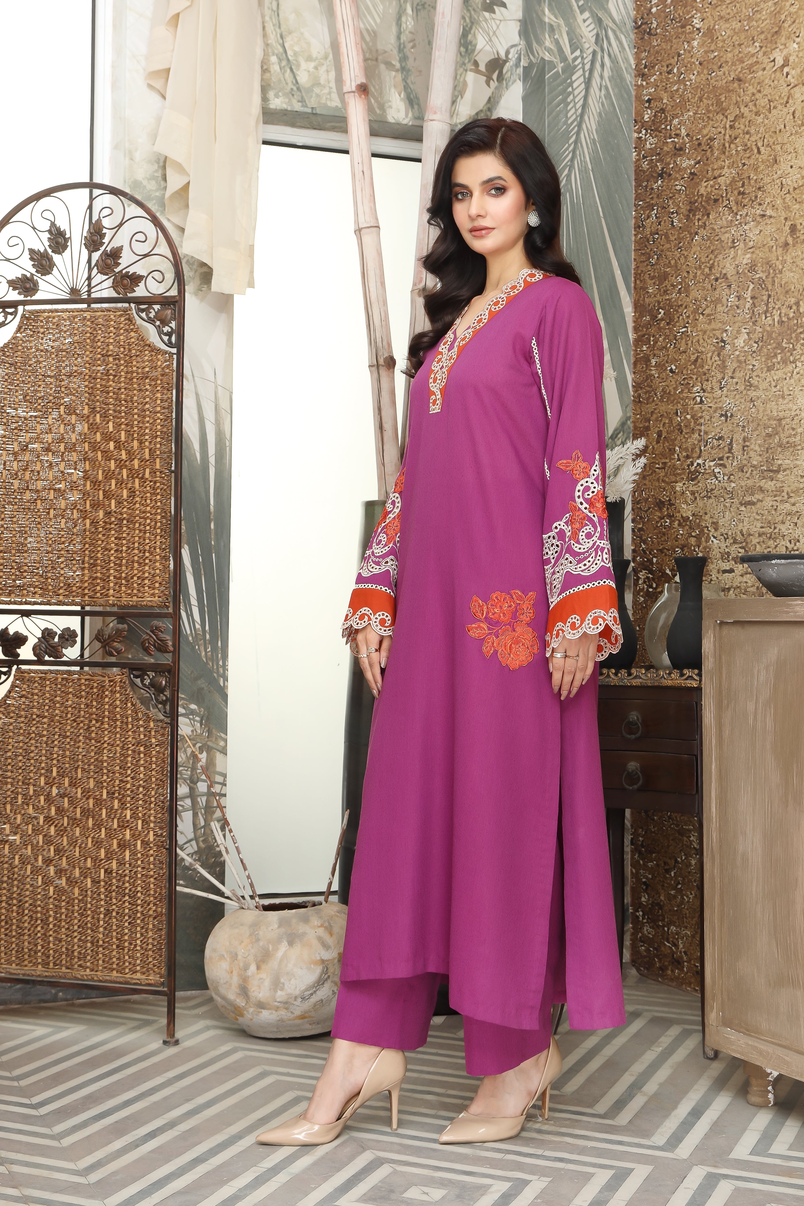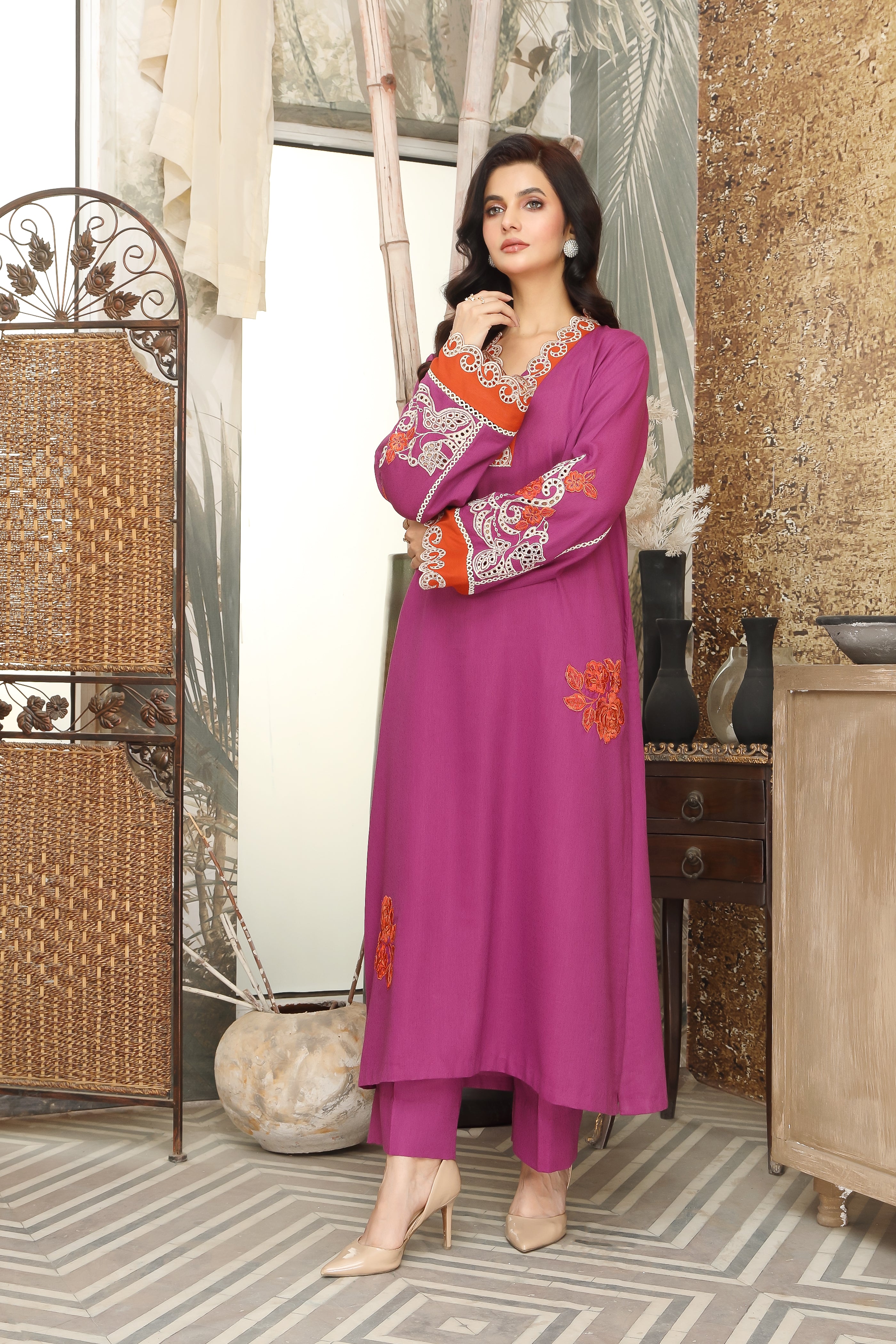 Chic two-piece embroidered suit with a beautifully detailed neckline, floral motifs, and artfully embroidered sleeves, paired with stylish culotte for a graceful, modern look.