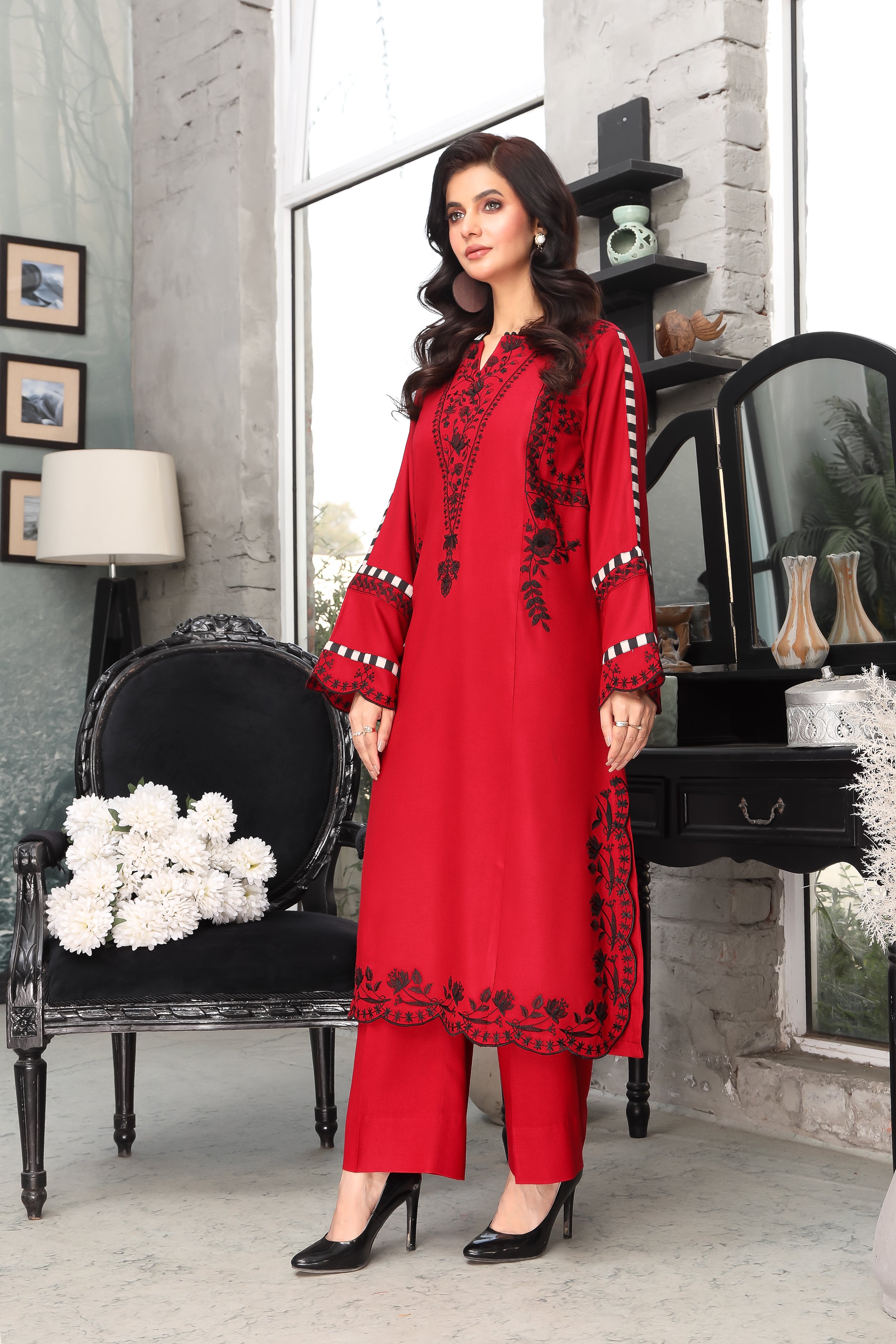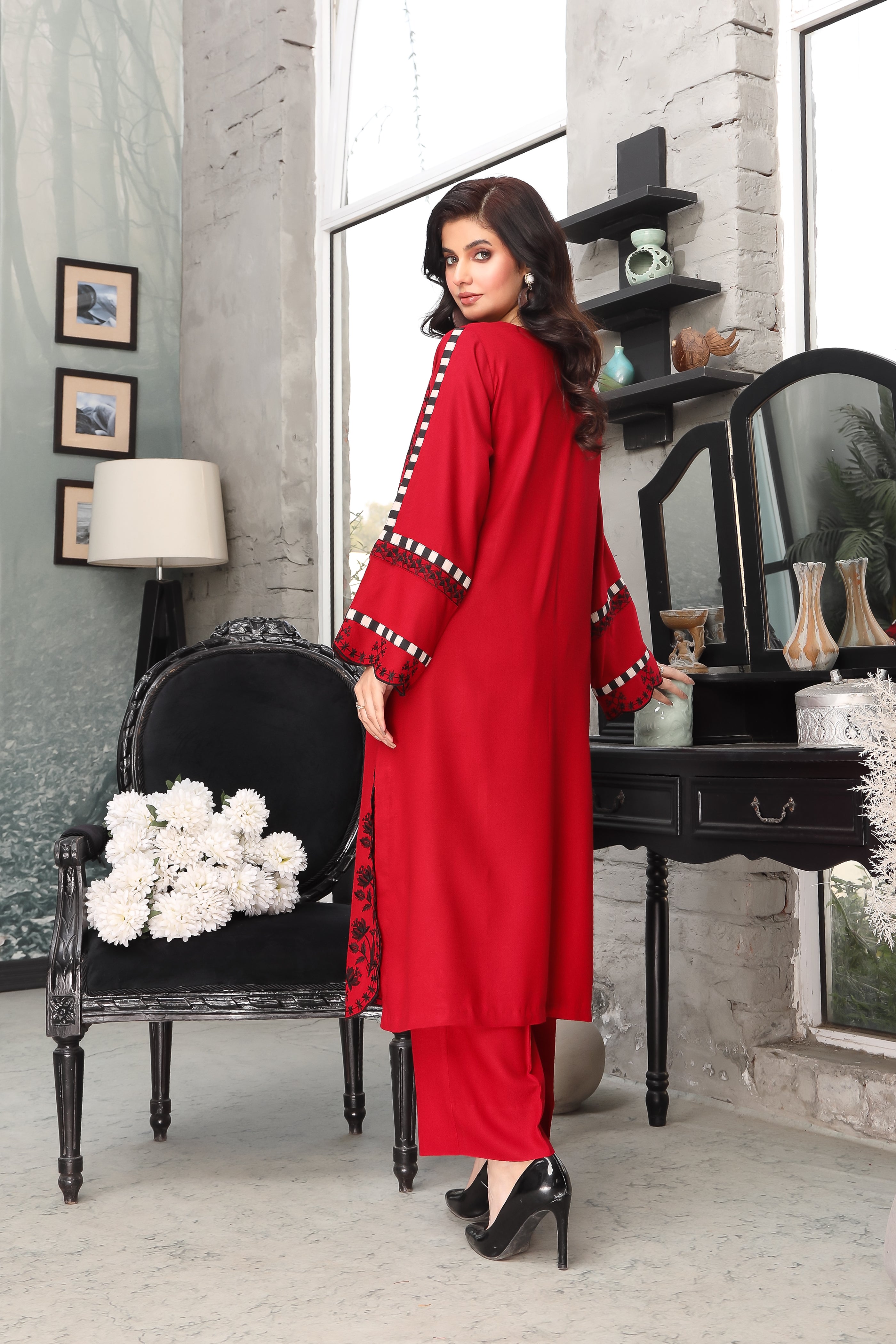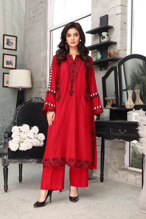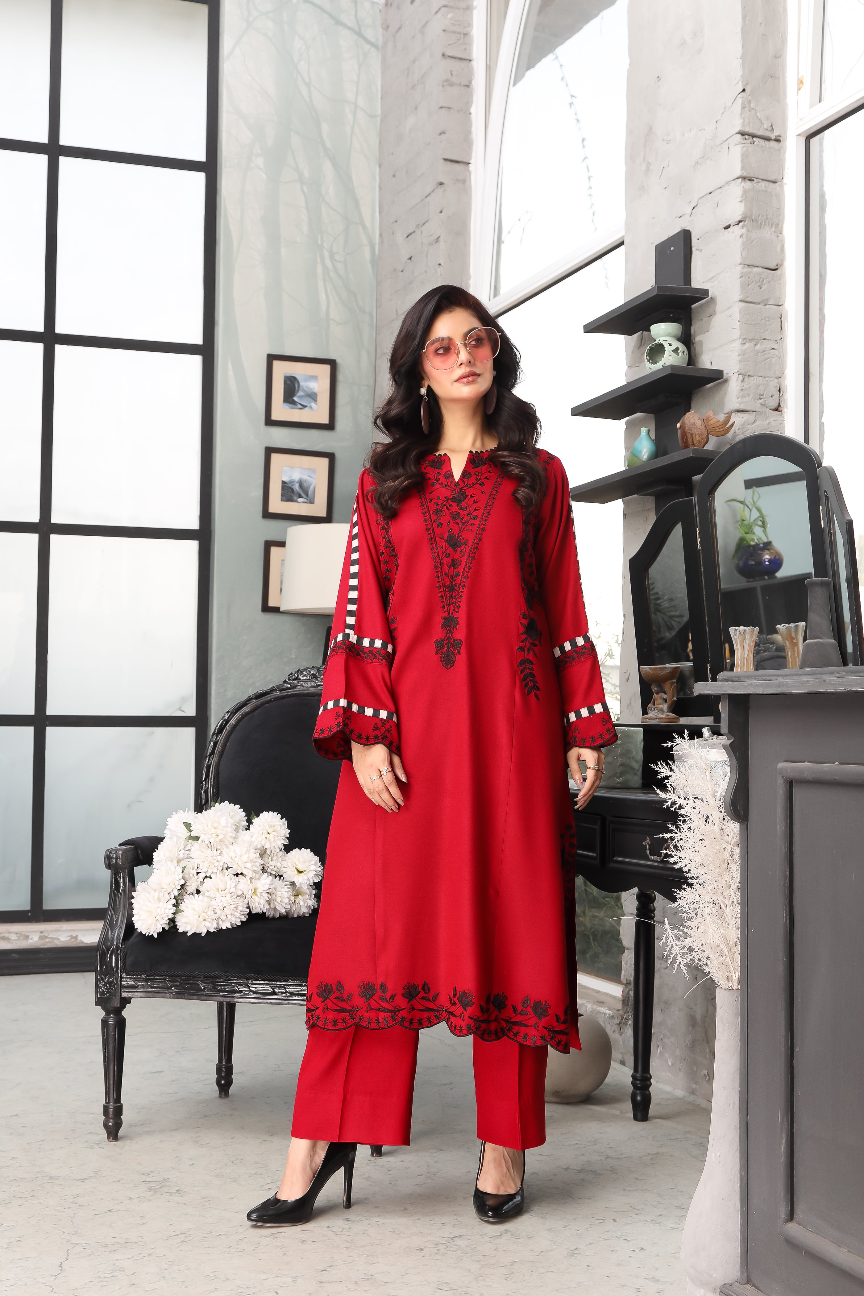 This stylish two-piece stitched suit features an embroidered panel shirt that exudes elegance and sophistication. The shirt is complemented by intricately embroidery and print detailing on the sleeves, adding a touch of artistic flair. The ensemble is paired with comfortable culotte trousers, creating a chic silhouette that is both modern and versatile.