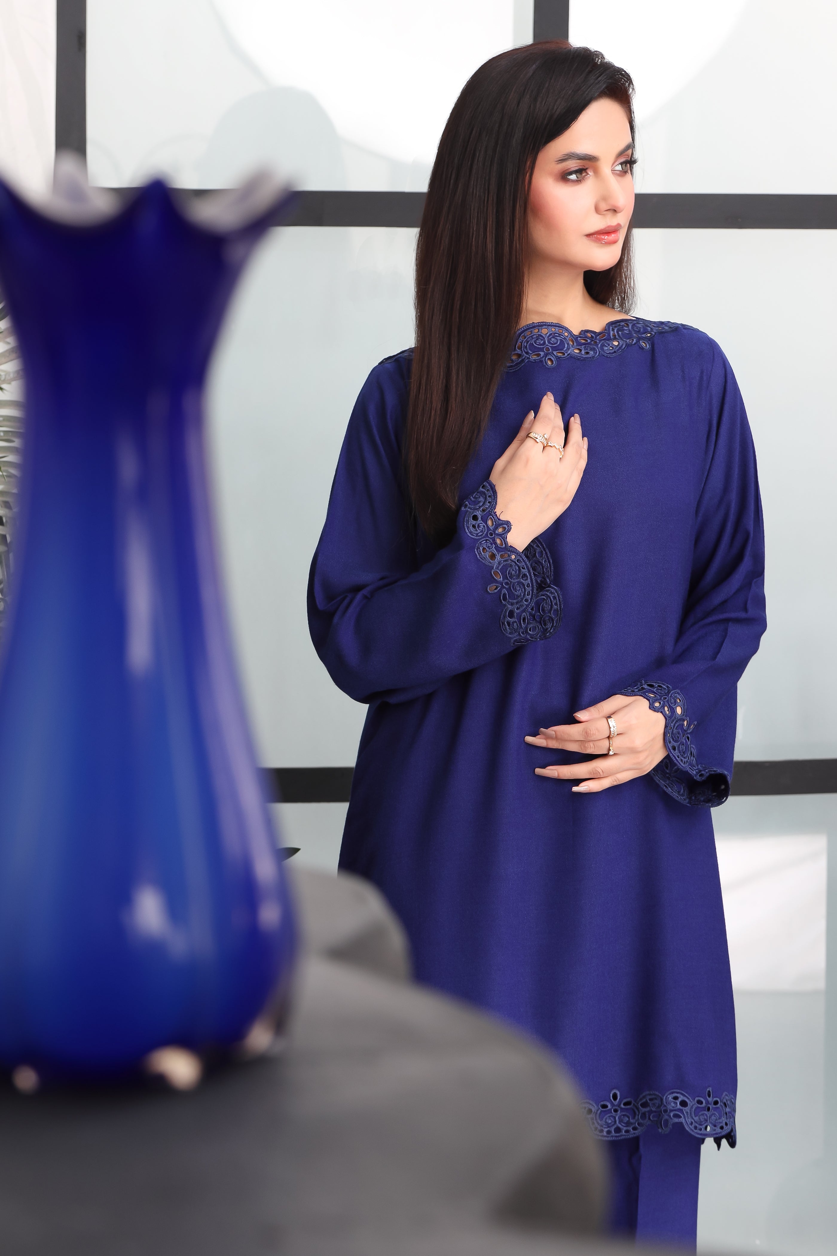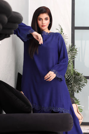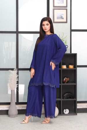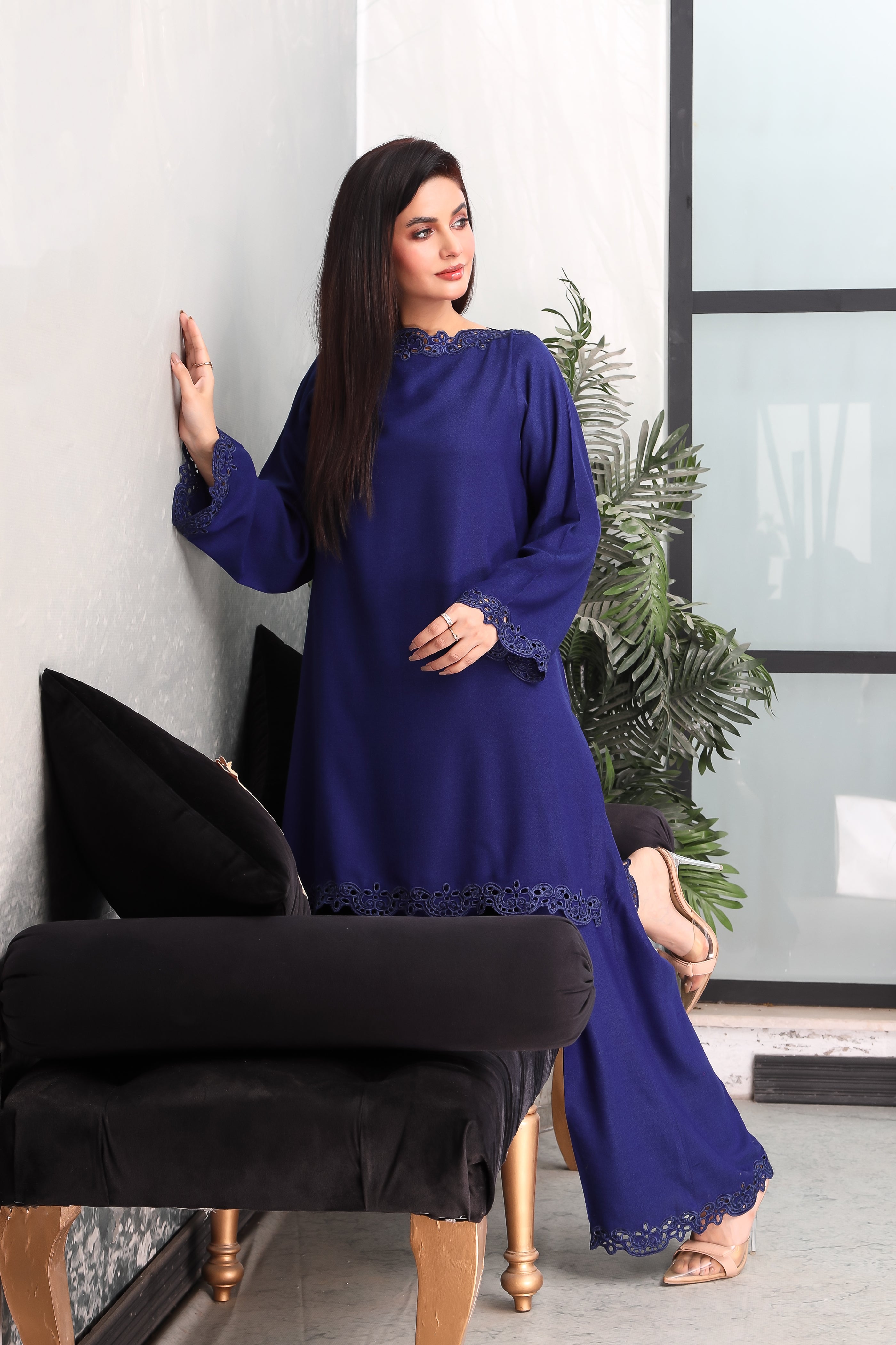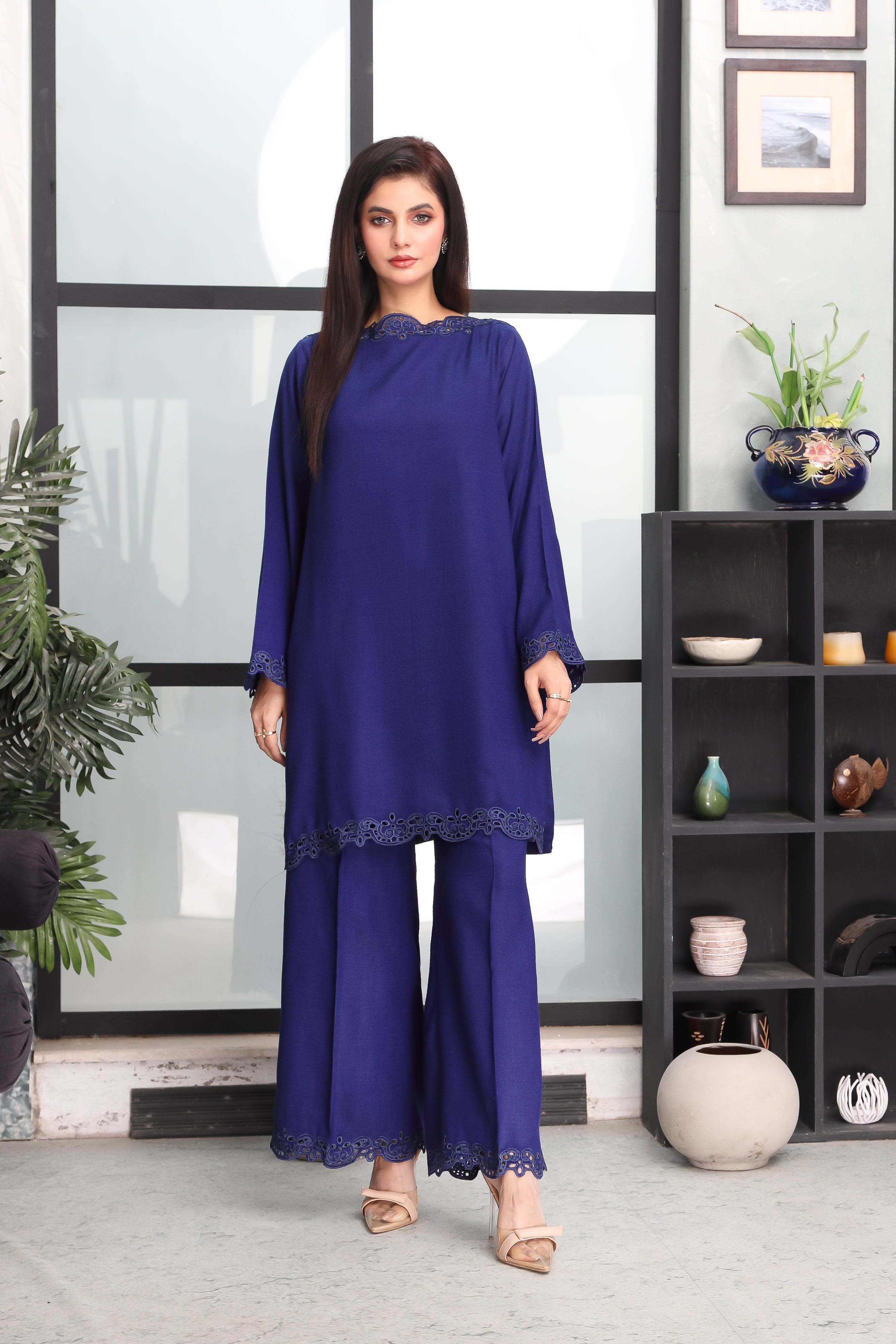 This stunning two-piece embroidered suit showcases a shirt adorned with exquisite embroidery on the neckline, sleeves, and daman, creating a harmonious and elegant design. The ensemble is complemented by culotte trousers featuring embroidered bottoms, adding a stylish touch to the overall look.