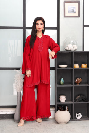 This stunning two-piece embroidered suit showcases a shirt adorned with exquisite embroidery on the neckline, sleeves, and daman, creating a harmonious and elegant design. The ensemble is complemented by culotte trousers featuring embroidered bottoms, adding a stylish touch to the overall look.