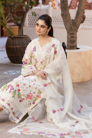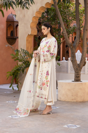 Step into timeless sophistication with Ivory Blossom, a beautifully embroidered ivory ensemble adorned with vibrant floral embroidery patterns. Designed for grace and refinement, this elegant outfit features a delicately crafted silhouette paired with a khadi net dupatta, adding a touch of airy elegance to the look.