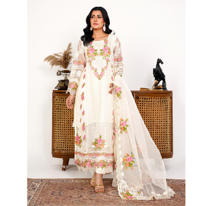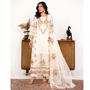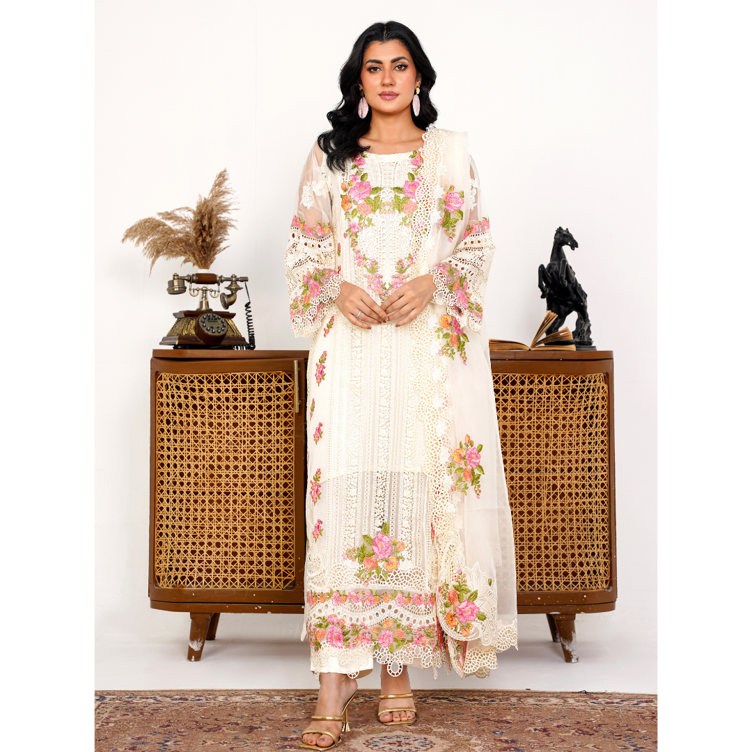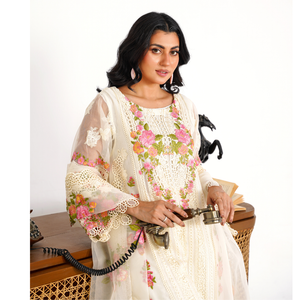 Radiate elegance in this Ivory organza ensemble, adorned with intricate threadwork, kavia detailing, and pastel floral embroidery. Paired with an embroidered dupatta, it’s the perfect blend of tradition and modern grace for festive occasions.