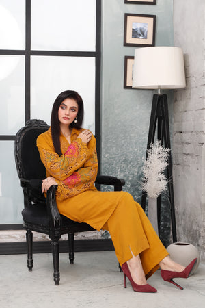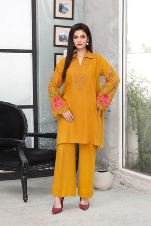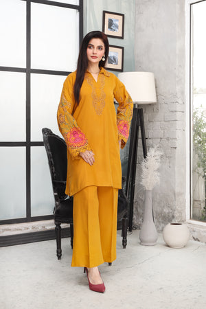 This beautifully crafted two-piece stitched suit showcases a finely embroidered collar and neckline, adding an eye-catching focal point. The sleeves feature embroidery enhanced with delicate lace trims paired with relaxed-fit culotte trouser.