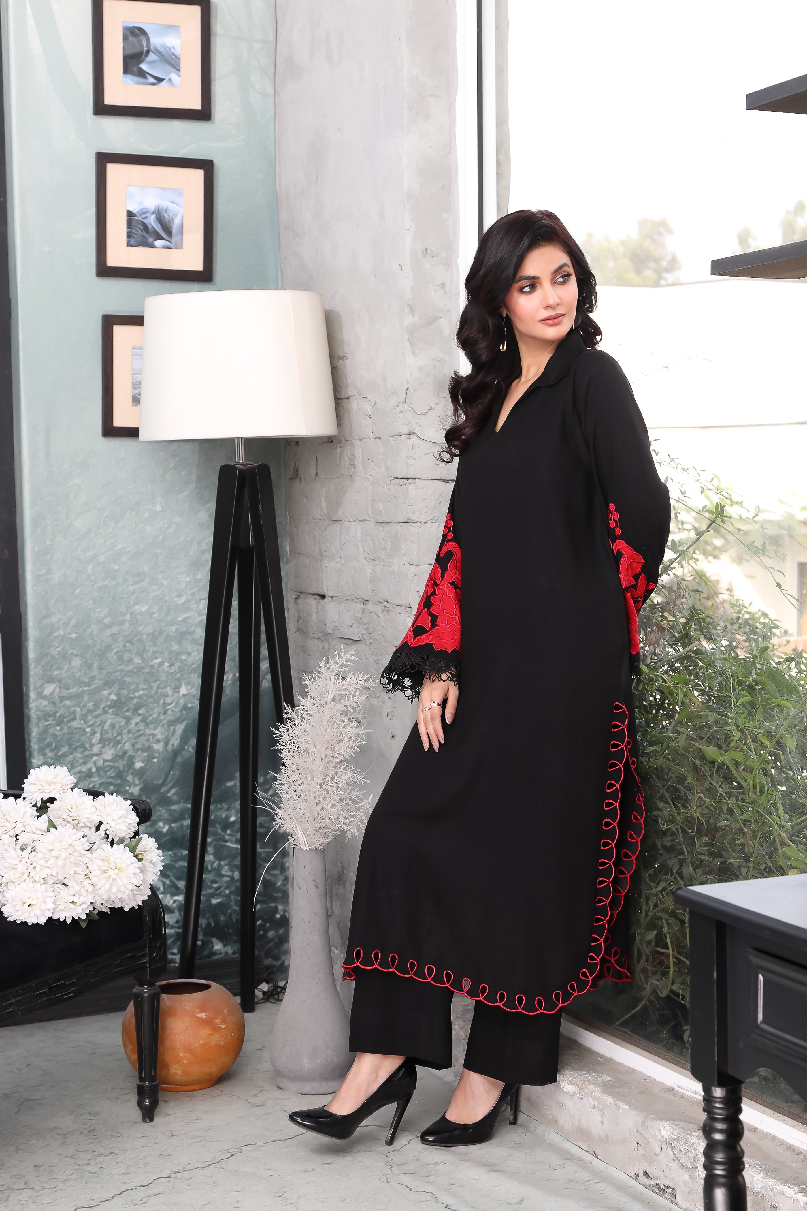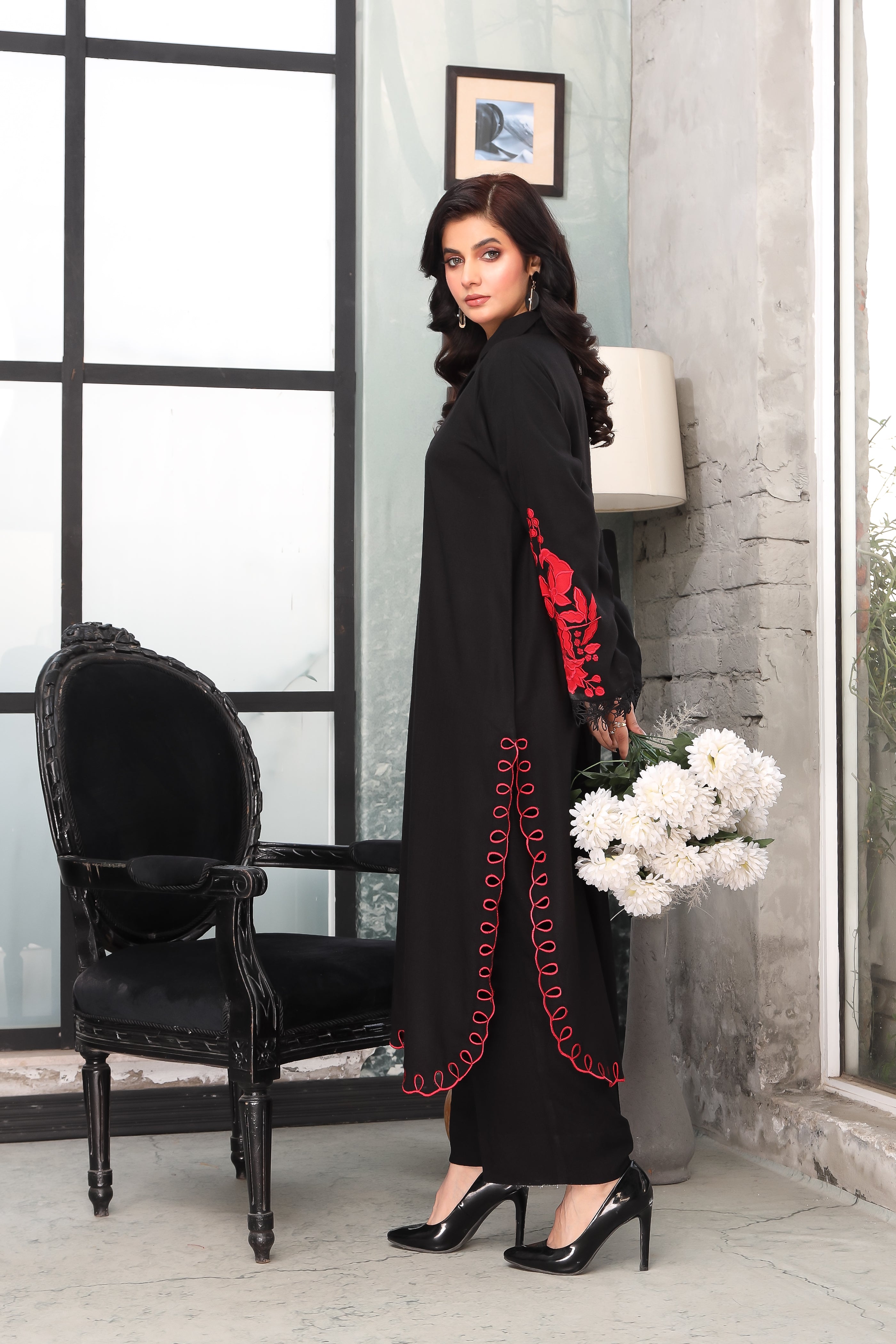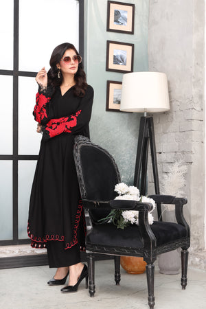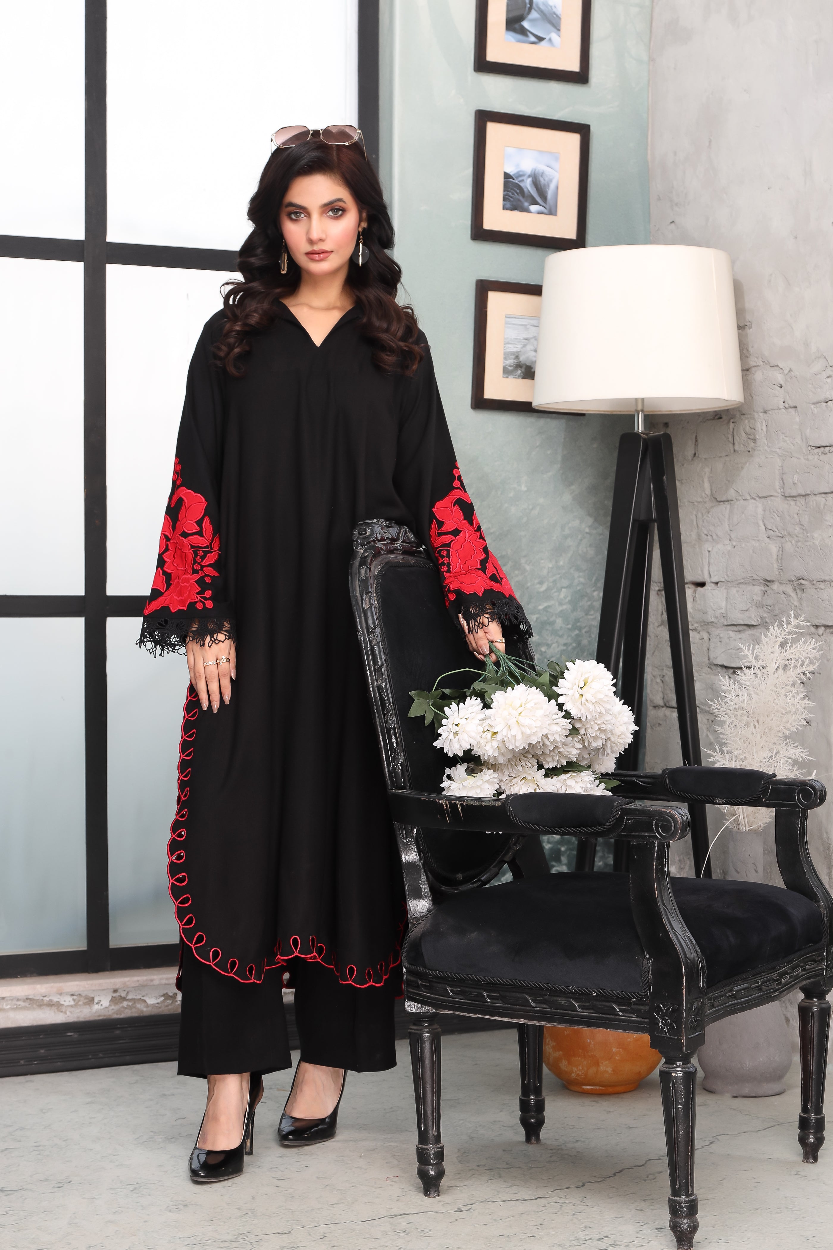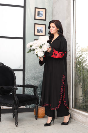 This sophisticated black two-piece outfit is your perfect go-to look for winter. The shirt features a round embroidered daman with exquisite appliqué work on the sleeves, enhanced by a delicate lace finish. Paired with sleek black culotte trousers, this ensemble combines elegance and comfort.