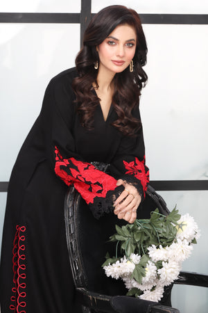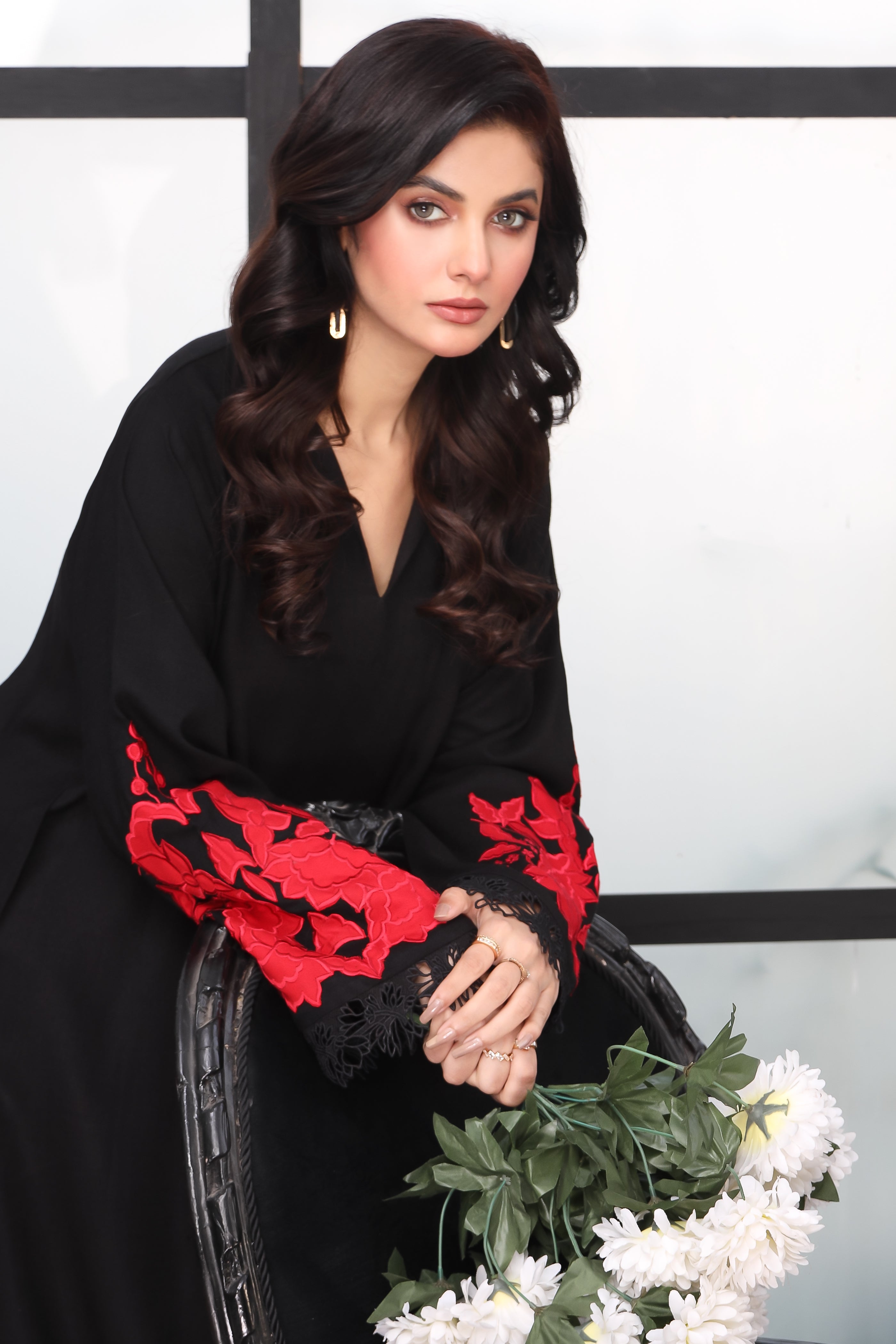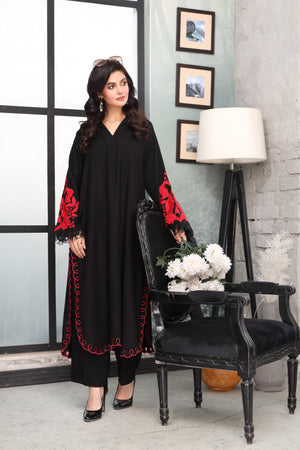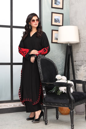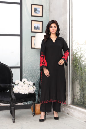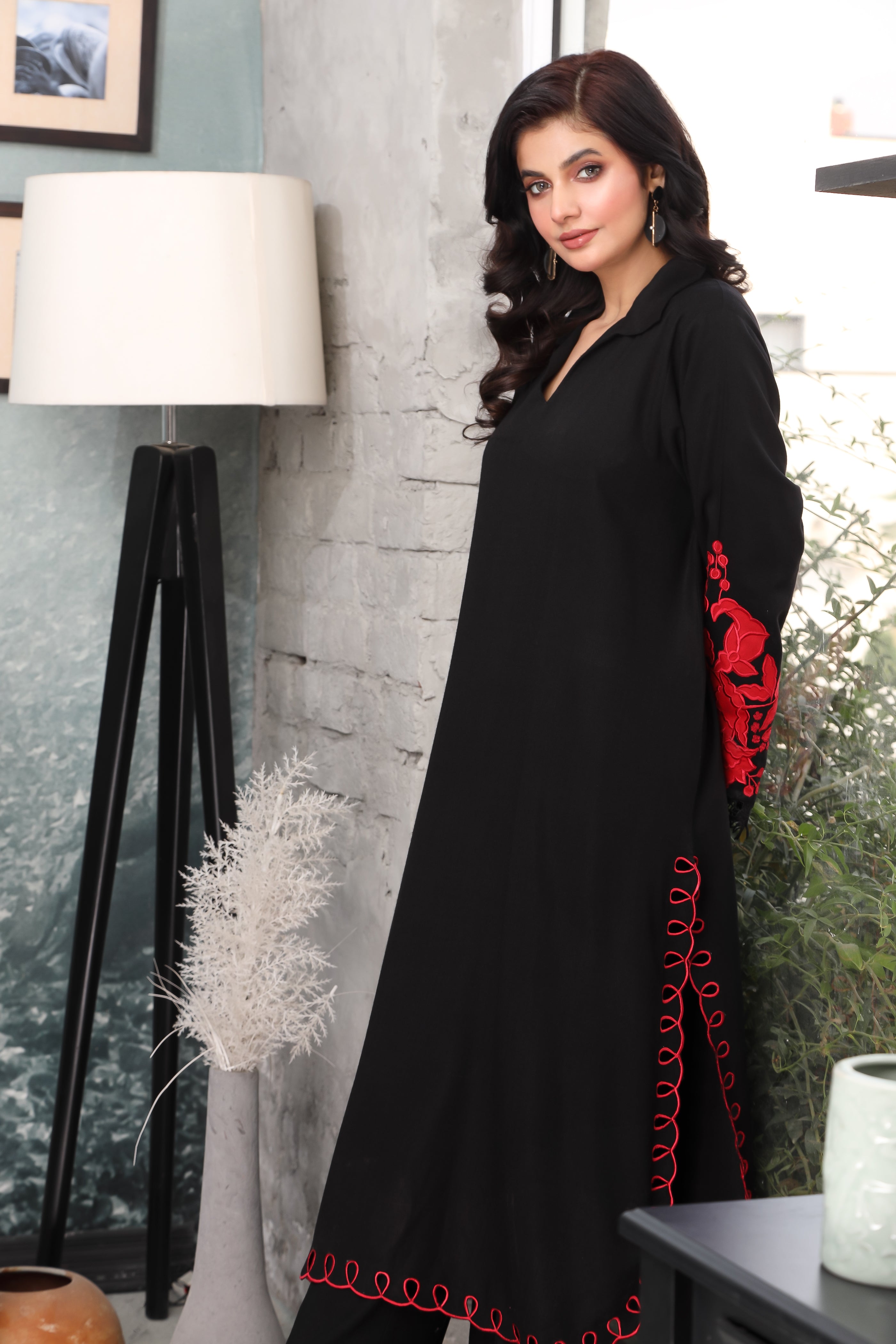 This sophisticated black two-piece outfit is your perfect go-to look for winter. The shirt features a round embroidered daman with exquisite appliqué work on the sleeves, enhanced by a delicate lace finish. Paired with sleek black culotte trousers, this ensemble combines elegance and comfort.